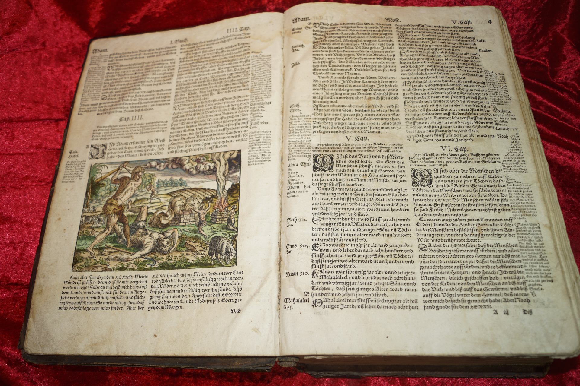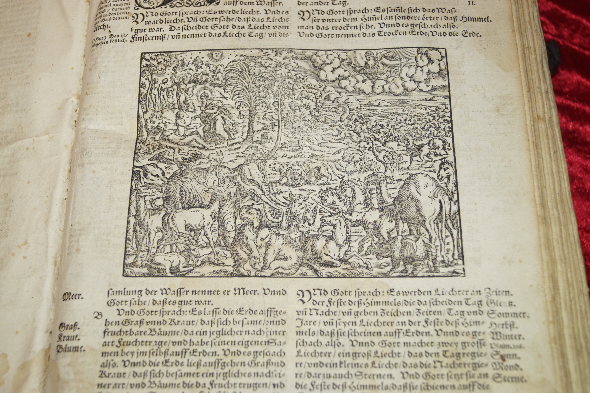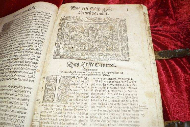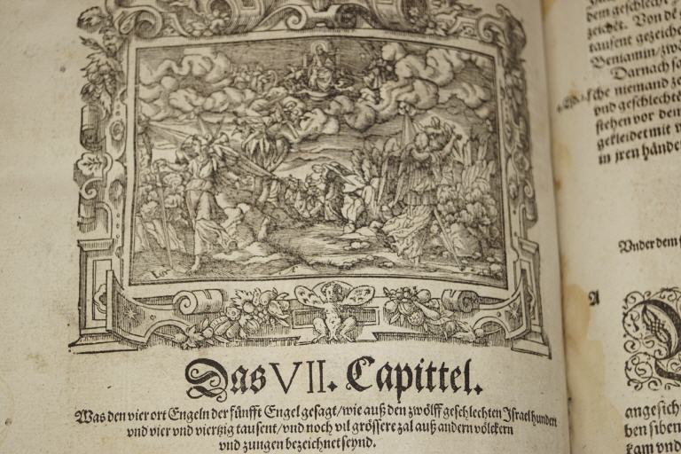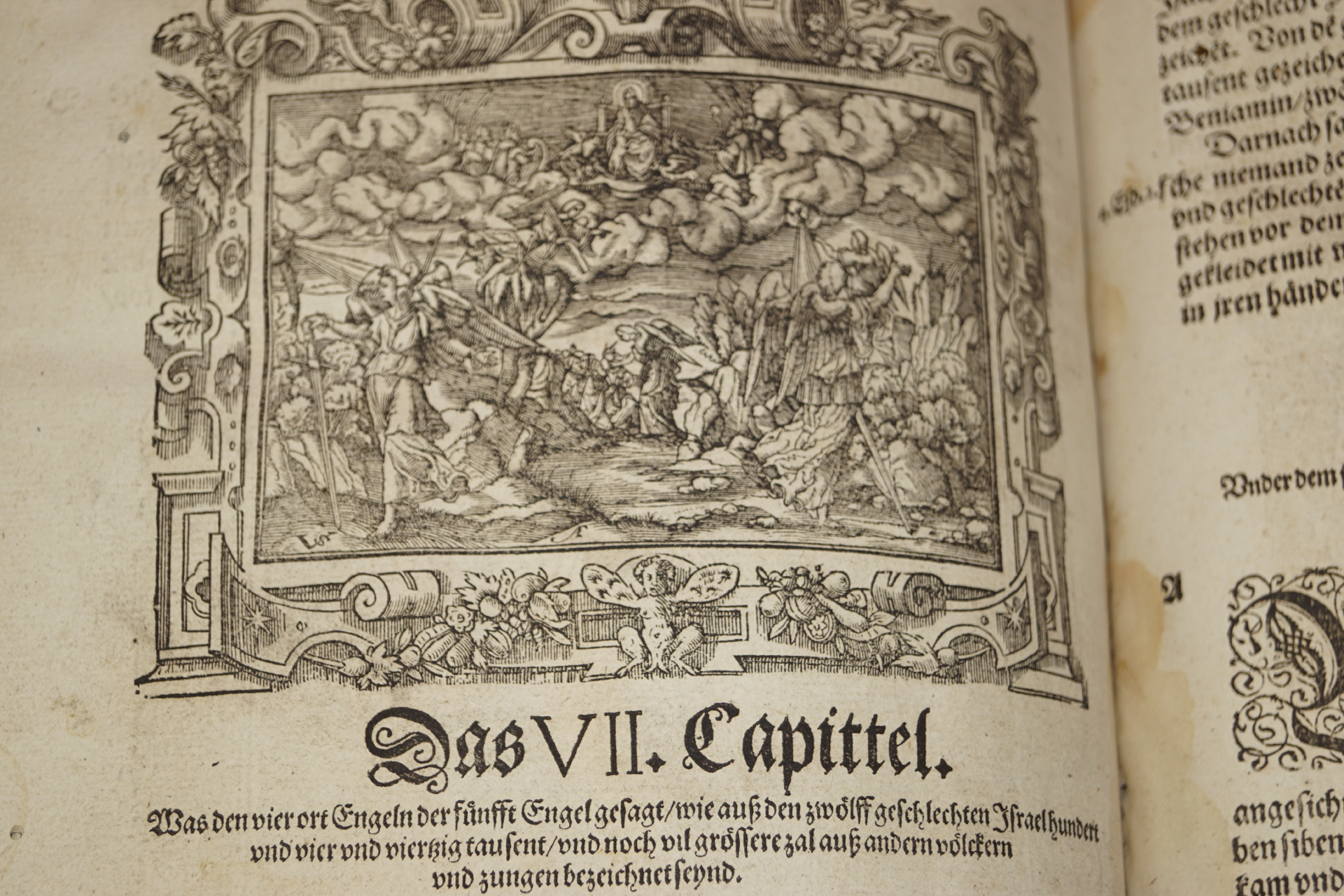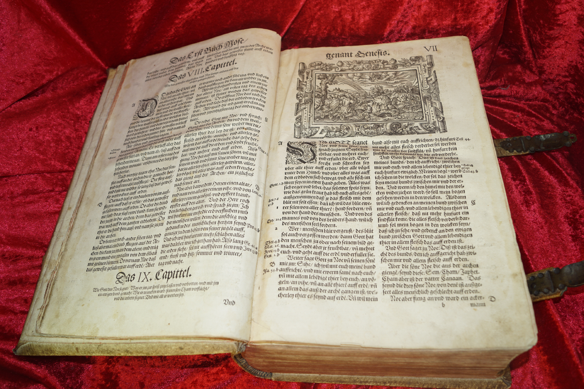 Mit zwei Holzschnitt Bordüren, dem großen ganzseitigen Erschaffungsholzschnitt und 128 breiten Textholzschnitten, die der Bibelausgabe von 1534 folgen (hier von Brosamer, Lemberger, wenige von Teufel).