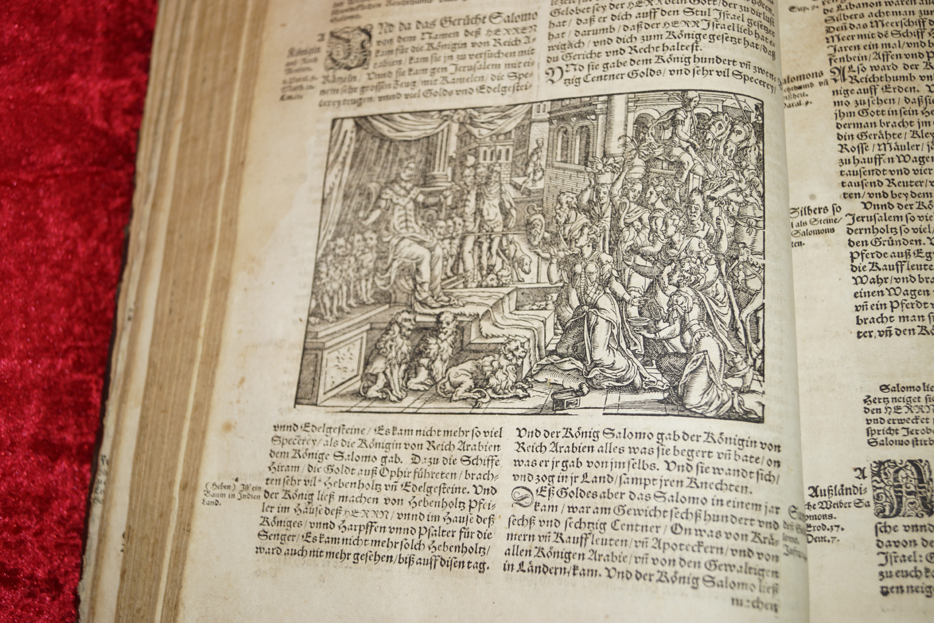 Sie erwerben die Frankfurter Feyerabend Bibel in der Ausgabe der Holzschnitte von Jost Amman aus dem Jahre 1578.Die beißende Kritik an der katholischen Obrigkeit (der Türke als barmherziger Samariter) und die hohe Texttreue der Holzschnitte, machten die erstmals 1564 herausgegebene Feyerabend-Amman Bibel auf der Stelle beliebt. Anfangs offenbar nur in kleiner Auflage gedruckt, wurde sie die Bibel aus Frankfurt.