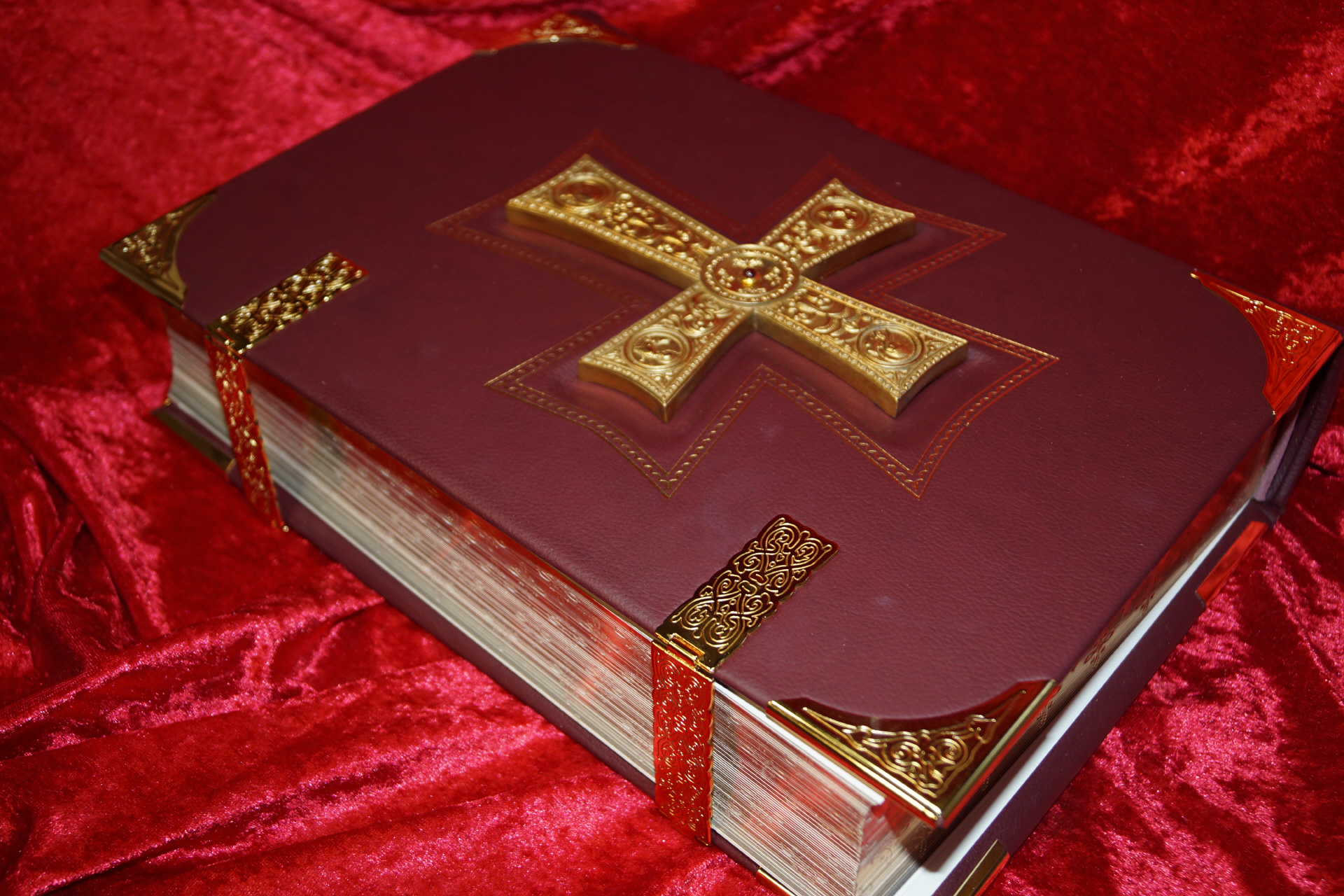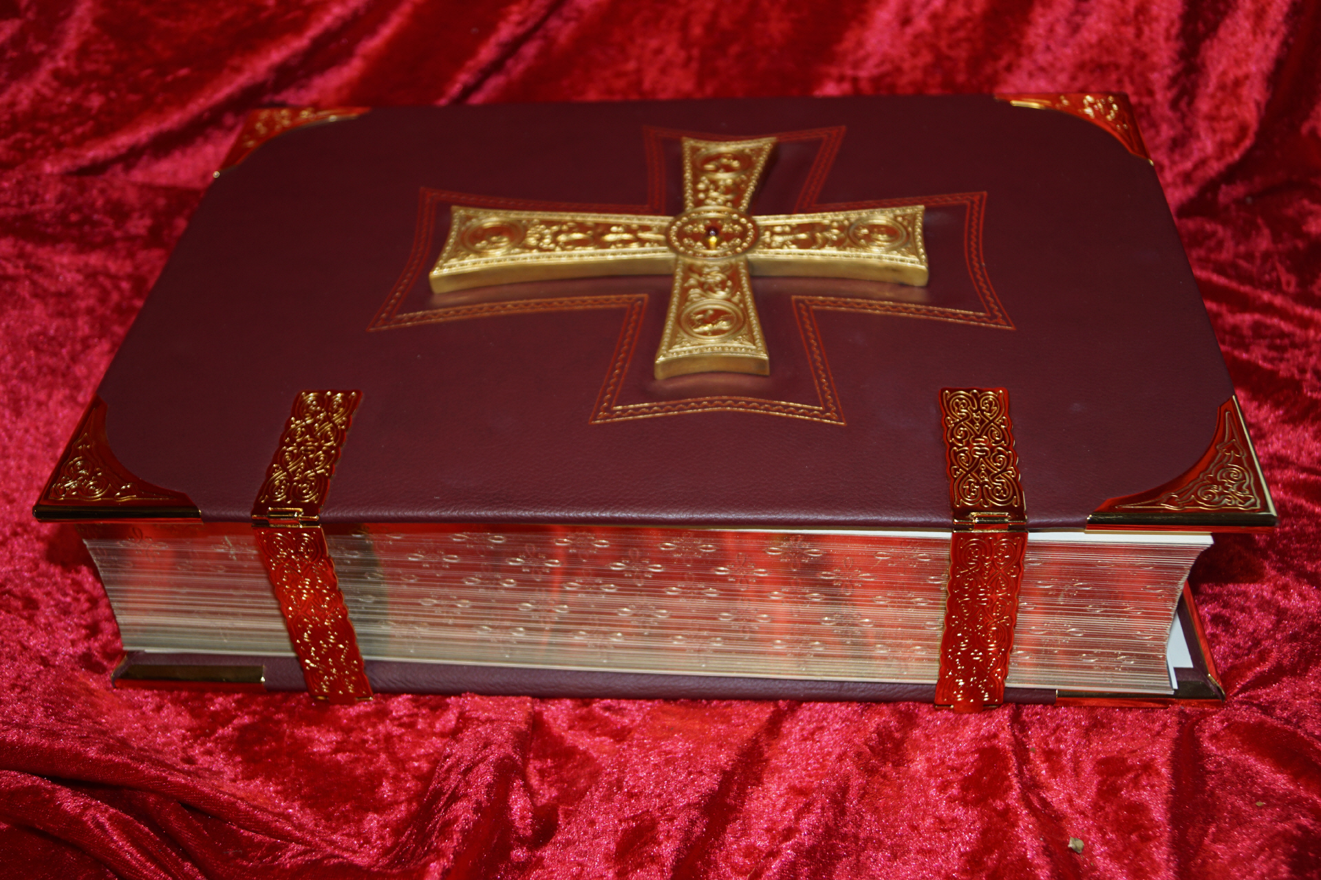 Einband: Luxusbindung in Echtleder mit acht Eckbeschlägen, zwei goldenen Schließen und punziertem Goldschnitt, in einer edlen Schmuckkassette Abnehmbares Kreuz mit Rubin.
