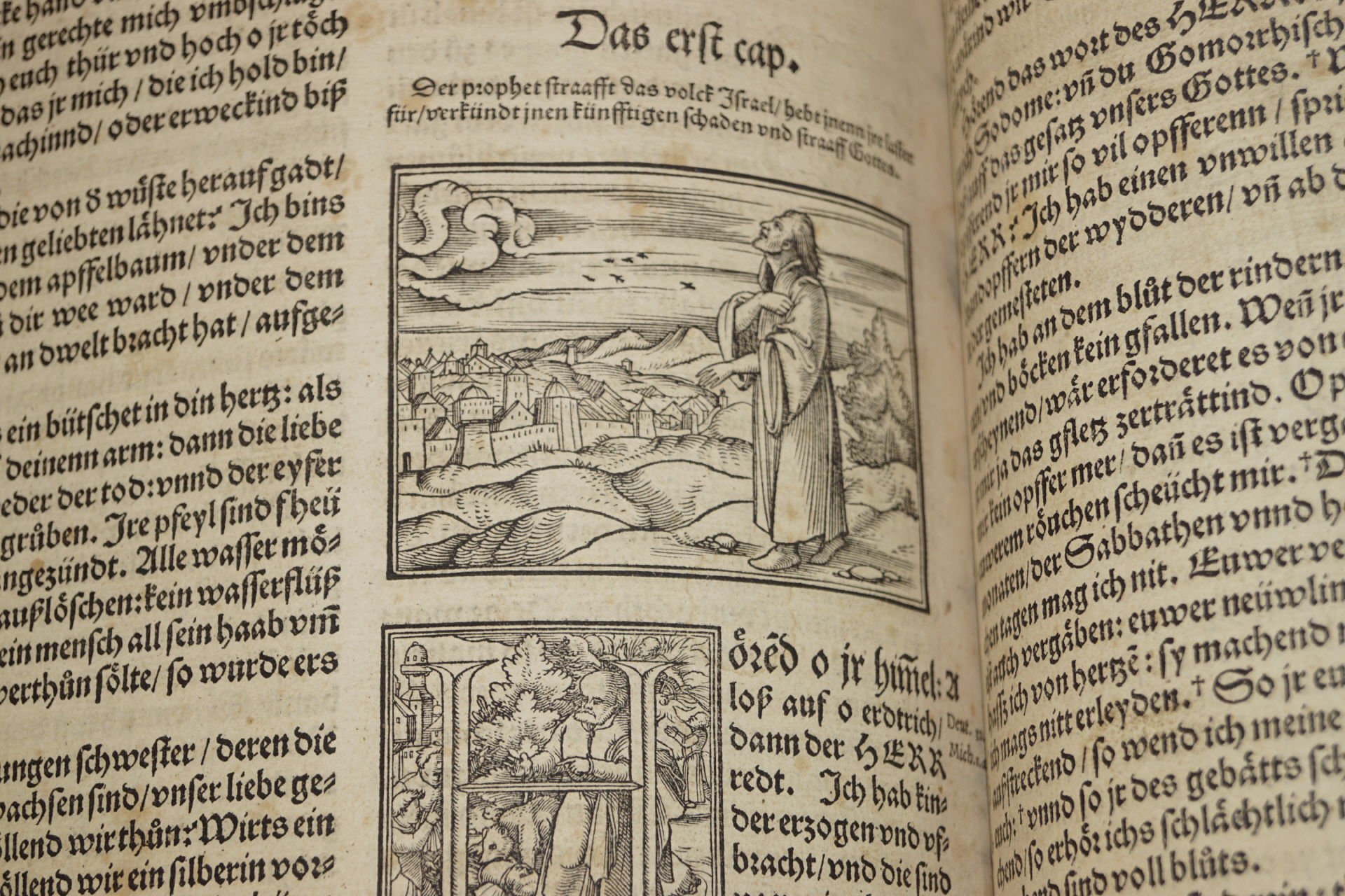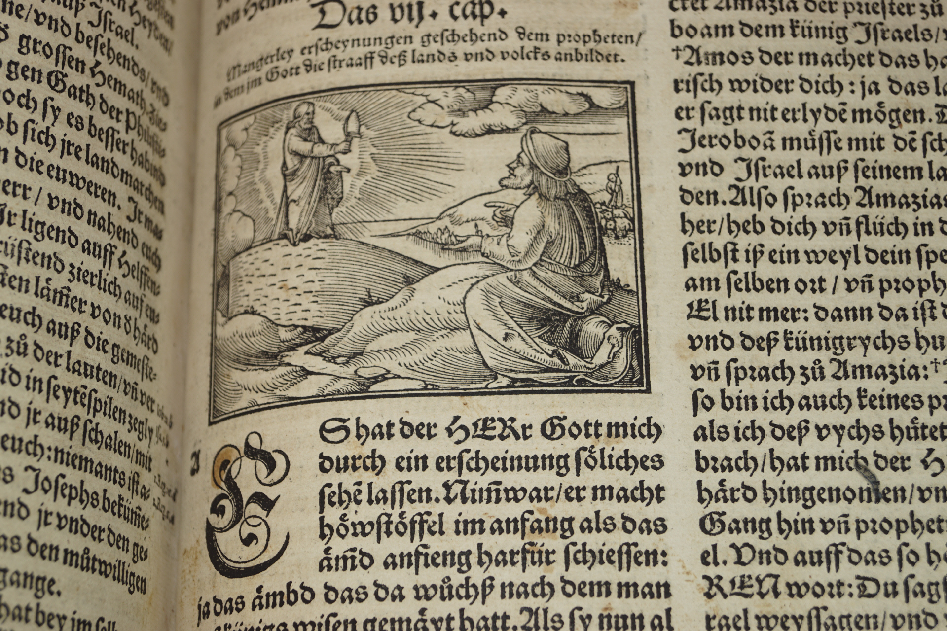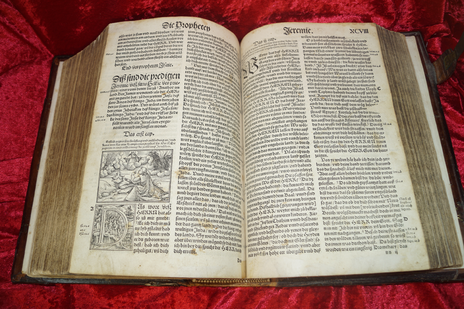 Das Buch ist mit kleinen Holzschnitten zu den Propheten illustriert. Folioformat 40 x 25 cm. Sehr gefälliges Schriftbild mit großem Satz!
