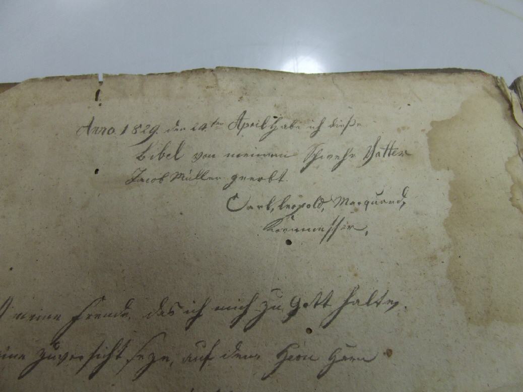 Die erste von mehreren Widmungen - hier die Bibel als Geschenk des Pflegevaters.