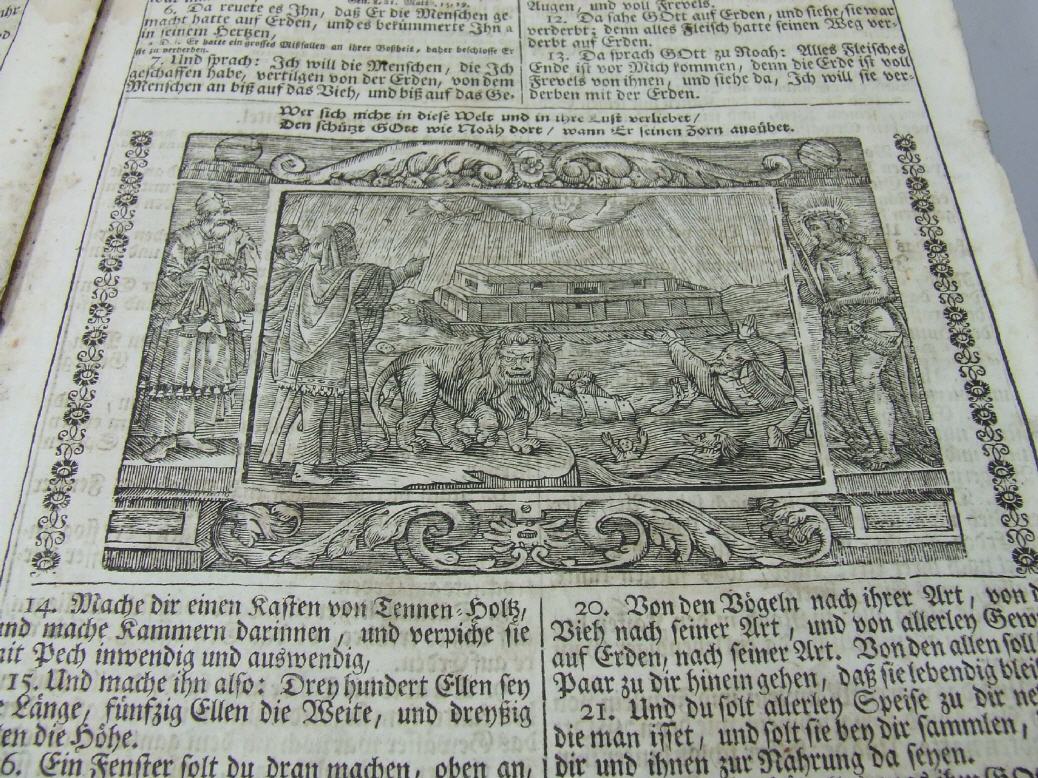 Beschreibung: Einband berieben und bestossen, einige Seiten wasserranndig, sonst vollständig. Übliche Frakturschrift der Zeit, zweispaltig - auch wie üblich, soweit nichts Besonderes. Der Reiz der Bibel besteht in der reichen Bebilderung. Da wurde zusammengeklaut und zusammengekauft, nachgeschnitten - wie man es eben brauchen konnte. Natürlich hatte das 18. Jahrhundert eine ganz andere Einstellung zum geistigen Eigentum. Und so finden sich in der Bibel Bilder von Virgil Solis, wie sie schon in der katholischen Dietenberger der 1570er Jahre gängig waren. Ebenso mit vielen Bildern vertreten ist Matthes (auch: Mathäus) Schultes (auch: Schulteis), der Ulmer Bibelillustrator.