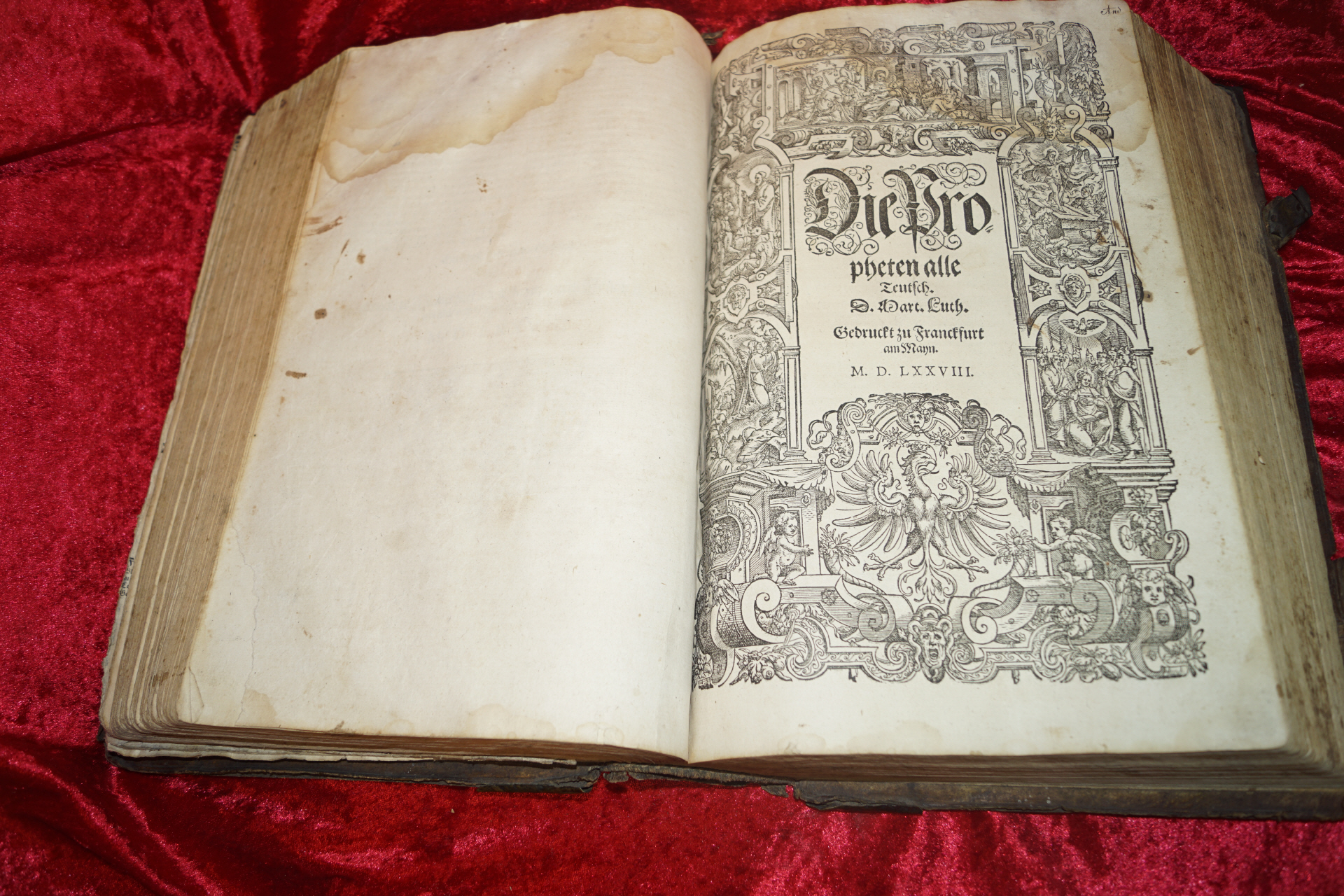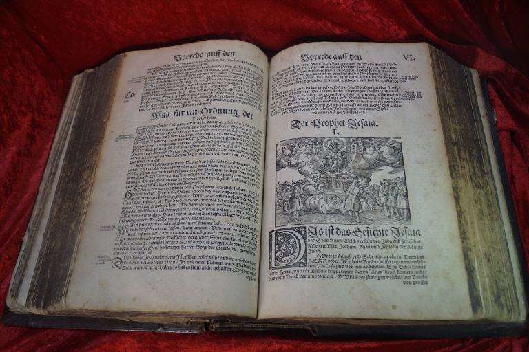 Das Buch ist mit kleinen Holzschnitten zu den Propheten illustriert. Folioformat 40 x 25 cm. Sehr gefälliges Schriftbild mit großem Satz!