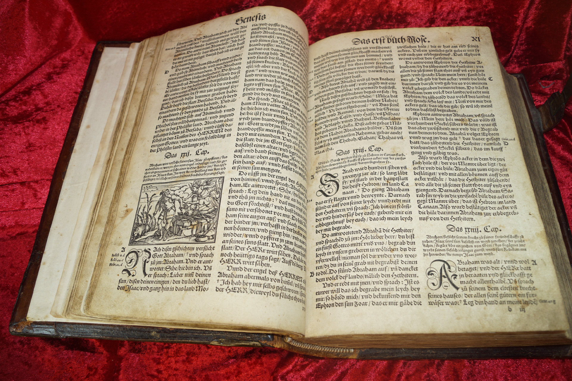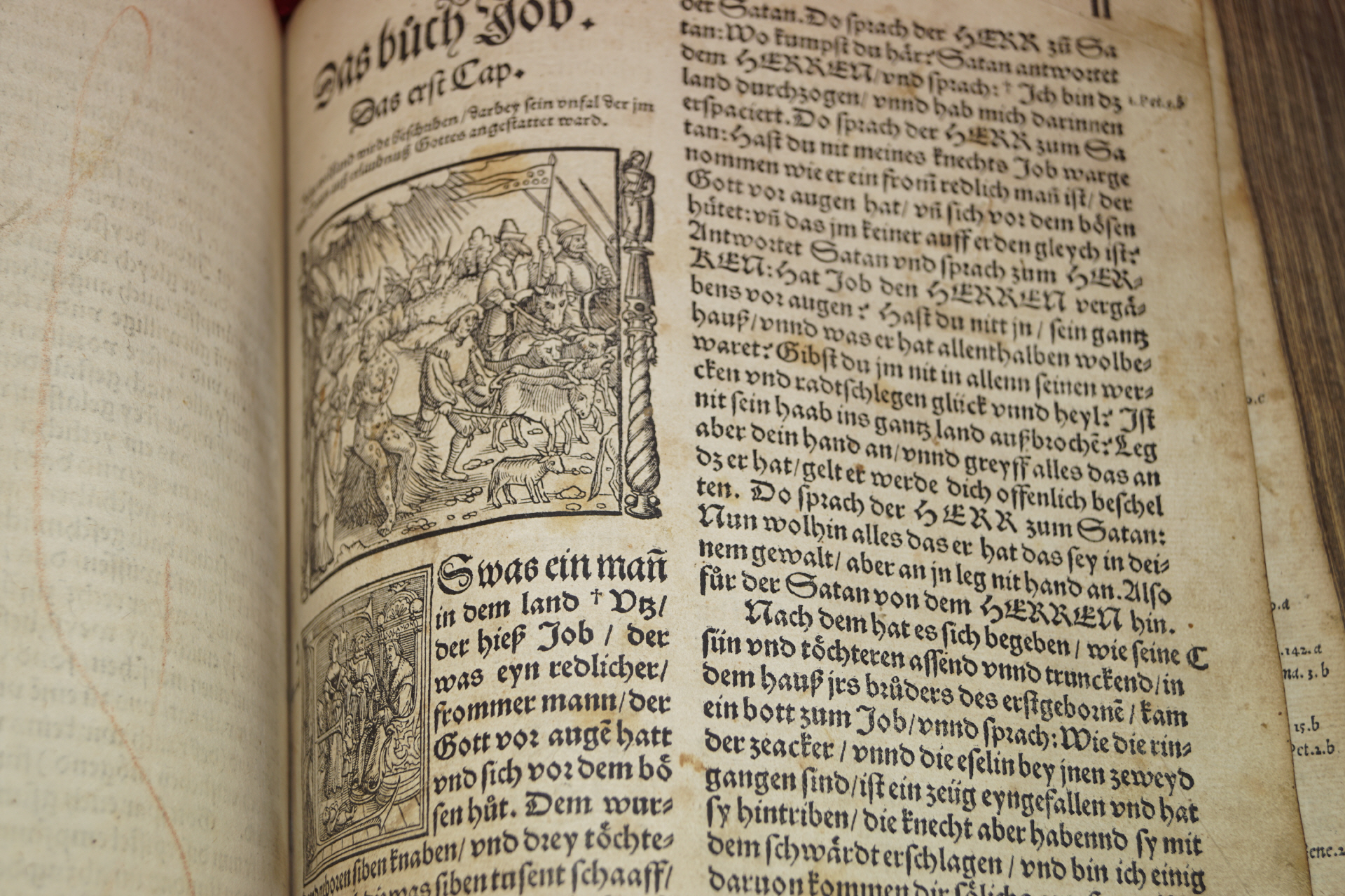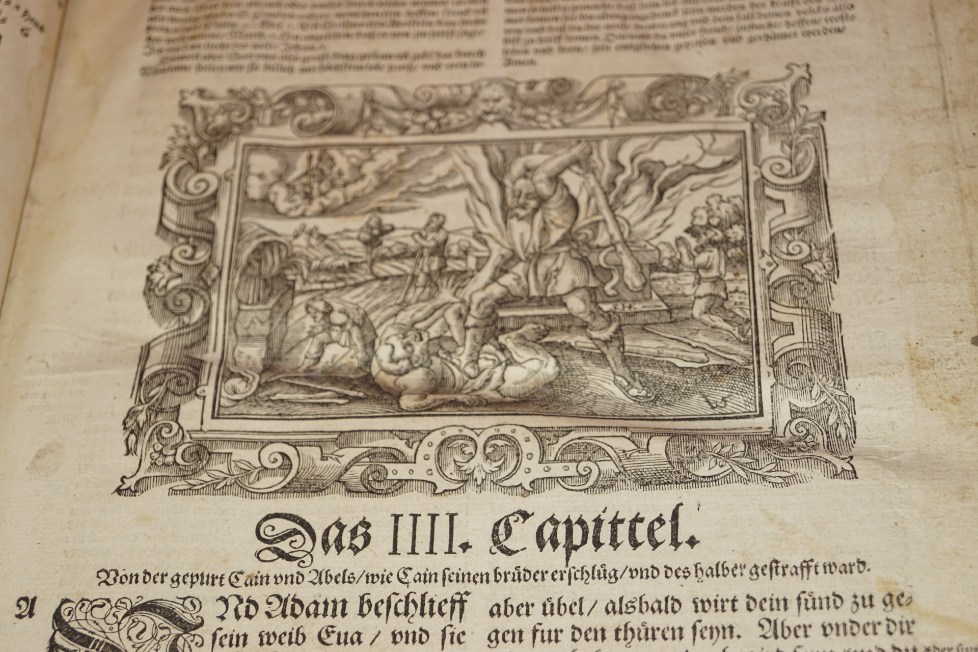 Mit zwei Holzschnitt Bordüren, dem großen ganzseitigen Erschaffungsholzschnitt und 128 breiten Textholzschnitten, die der Bibelausgabe von 1534 folgen (hier von Brosamer, Lemberger, wenige von Teufel).