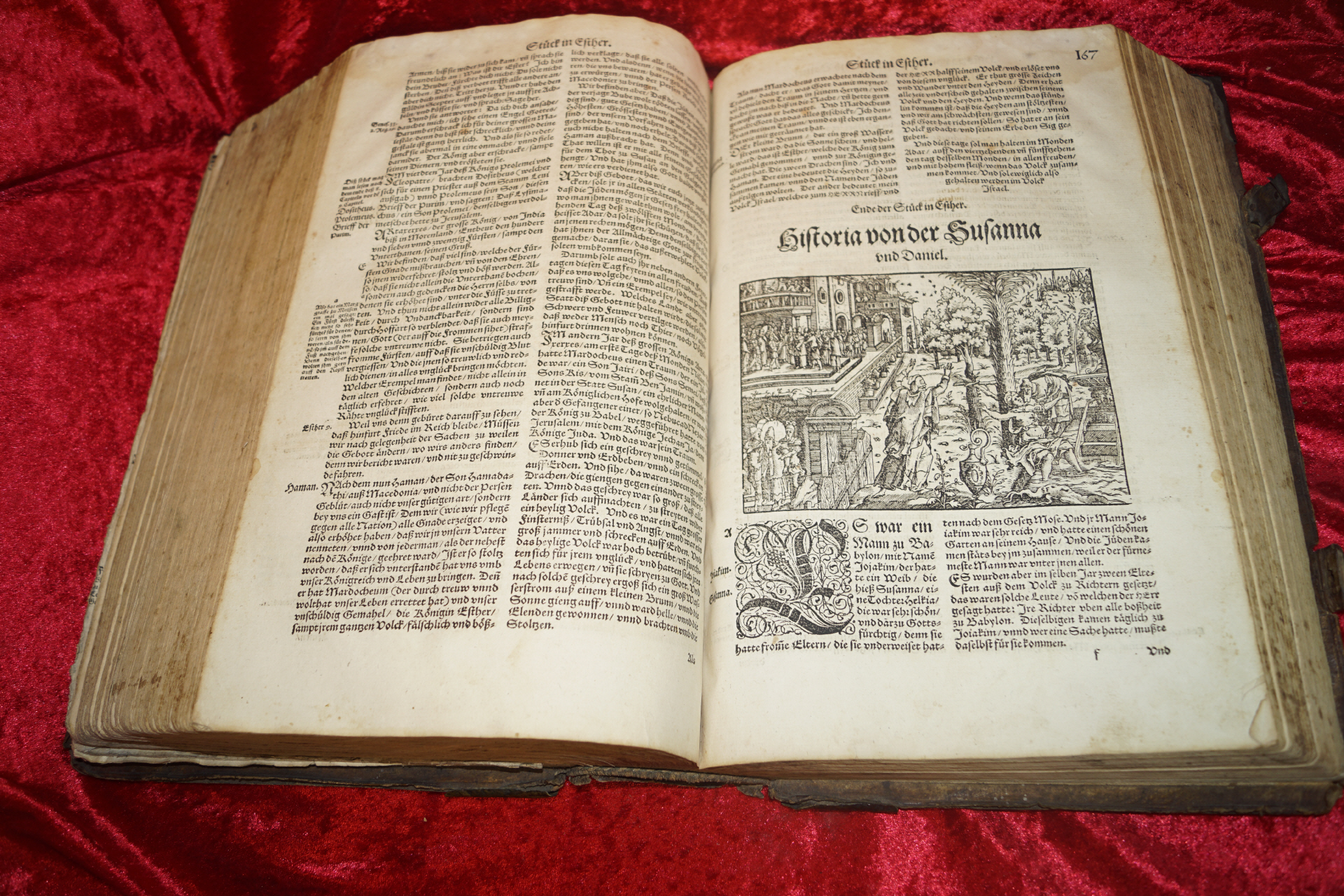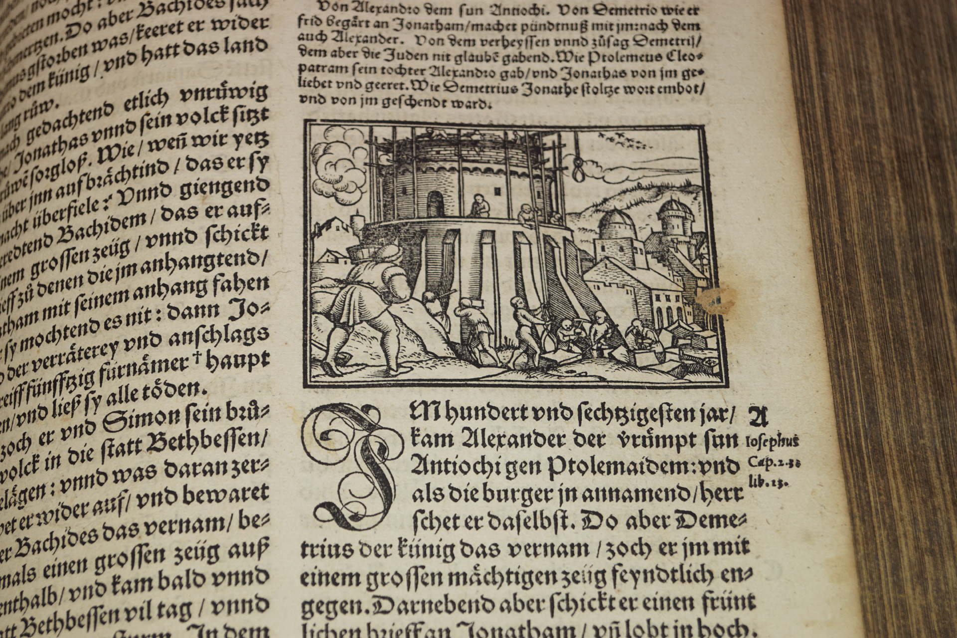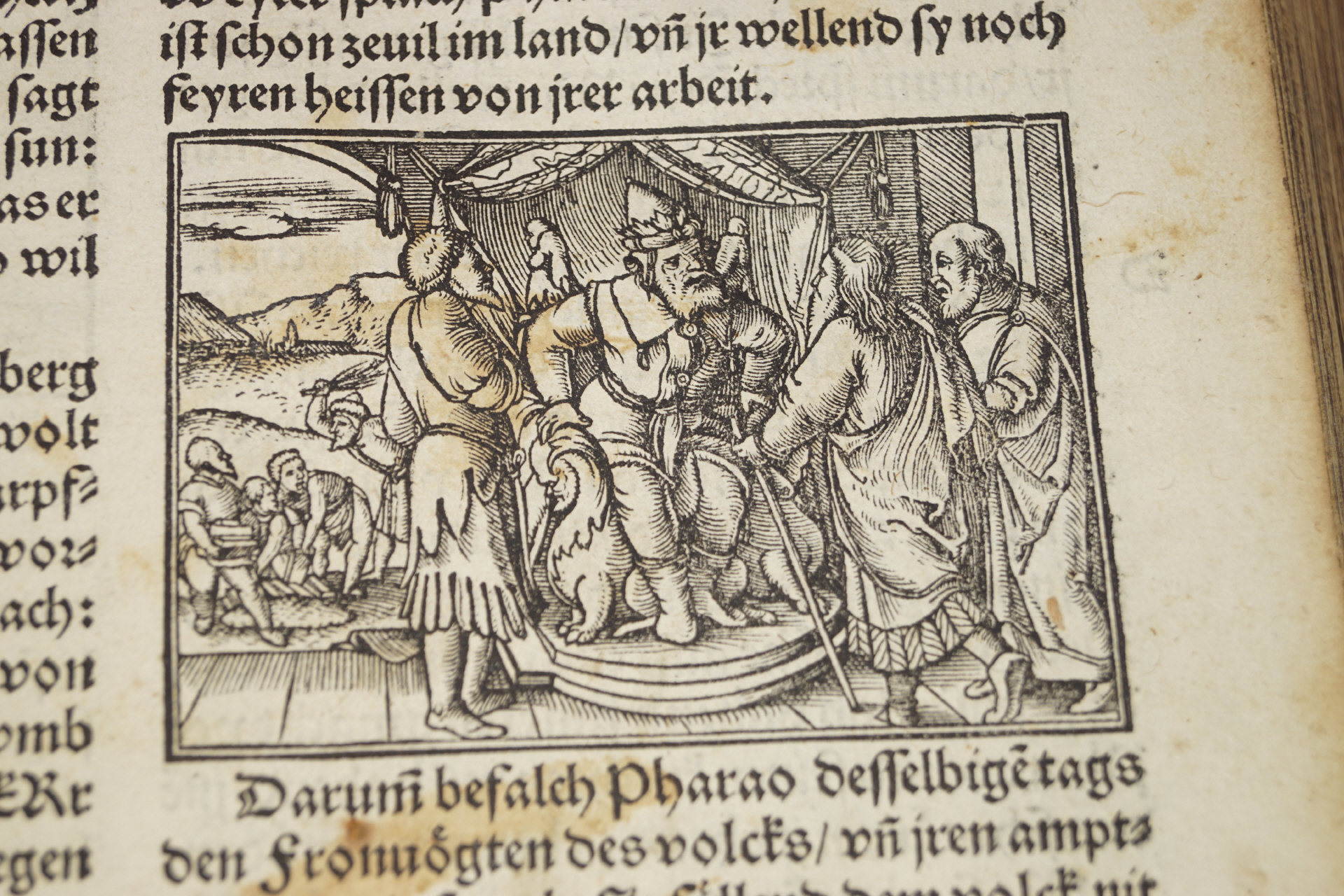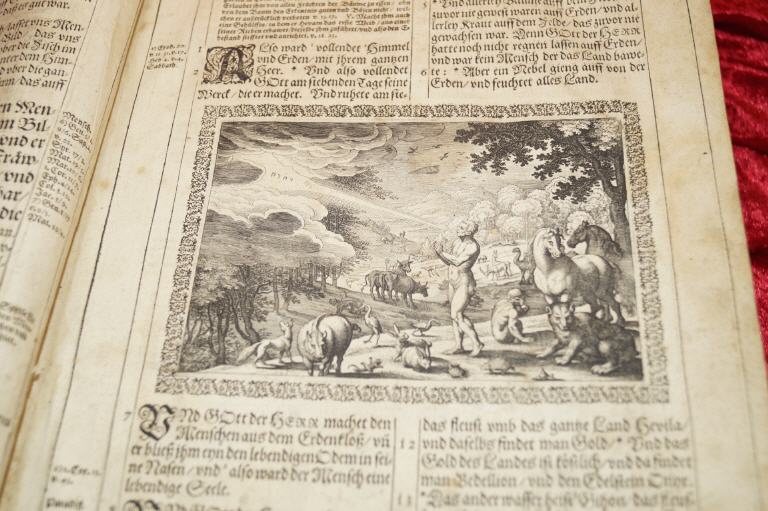 Mit zwei Holzschnitt Bordüren, dem großen ganzseitigen Erschaffungsholzschnitt und 128 breiten Textholzschnitten, die der Bibelausgabe von 1534 folgen (hier von Brosamer, Lemberger, wenige von Teufel).