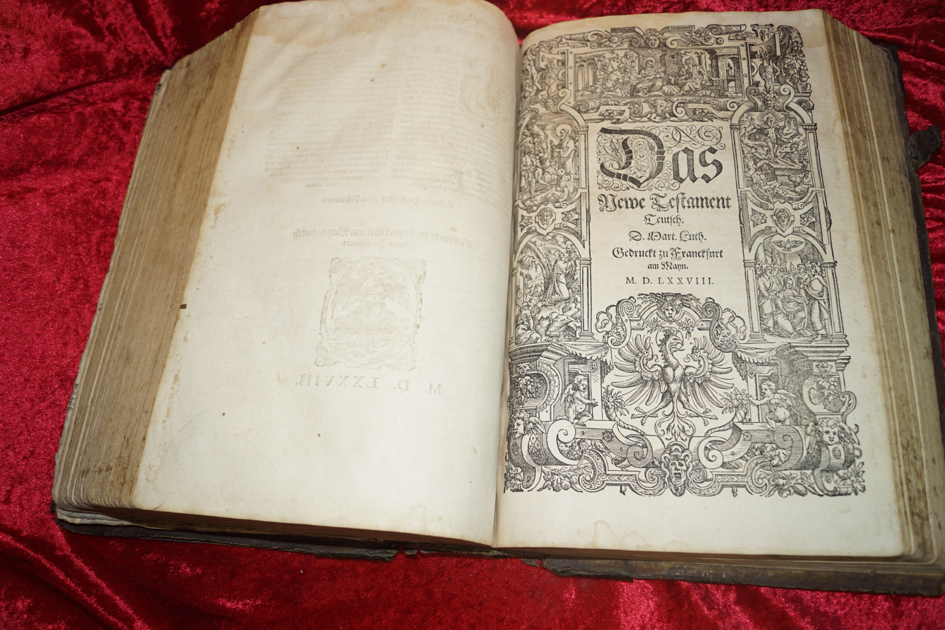 Die meisten Bibeln dieser Herkunft sind sehr zerlesen und haben viele fehlende Seiten. Dieser Ausgabe fehlt nur der Titel am Anfang, alles andere - auch die beiden anderen Titeln sind vorhanden! Auch das oft fehlende Biblische Namen- und Chronikbuch (1579) ist beigegeben.