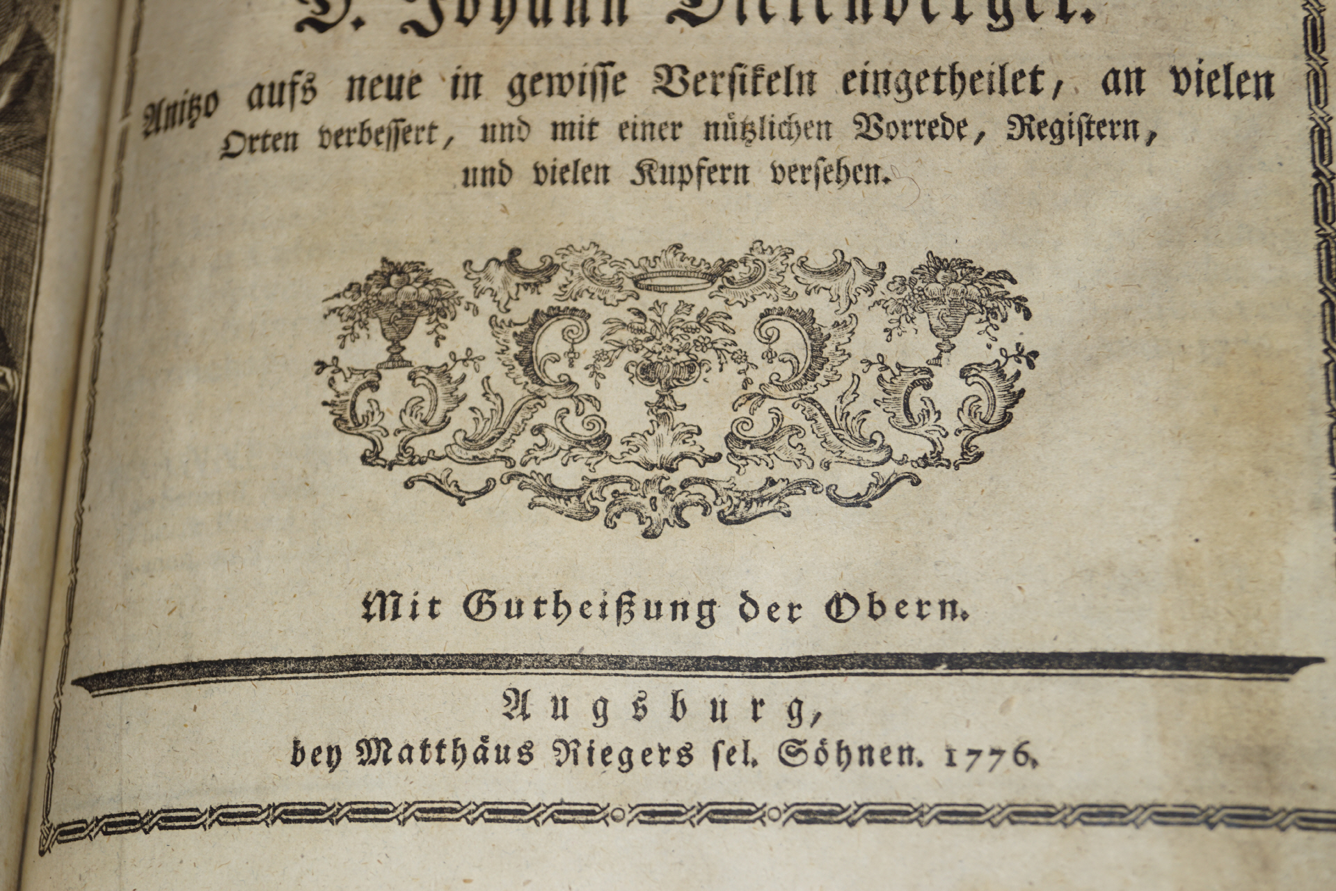 Bei Matthäus Riegers Söhne in Augsburg gedruckt. Mit den beiden Titelblättern, 684 Bll., 30 Bll., 1020, 288 S.