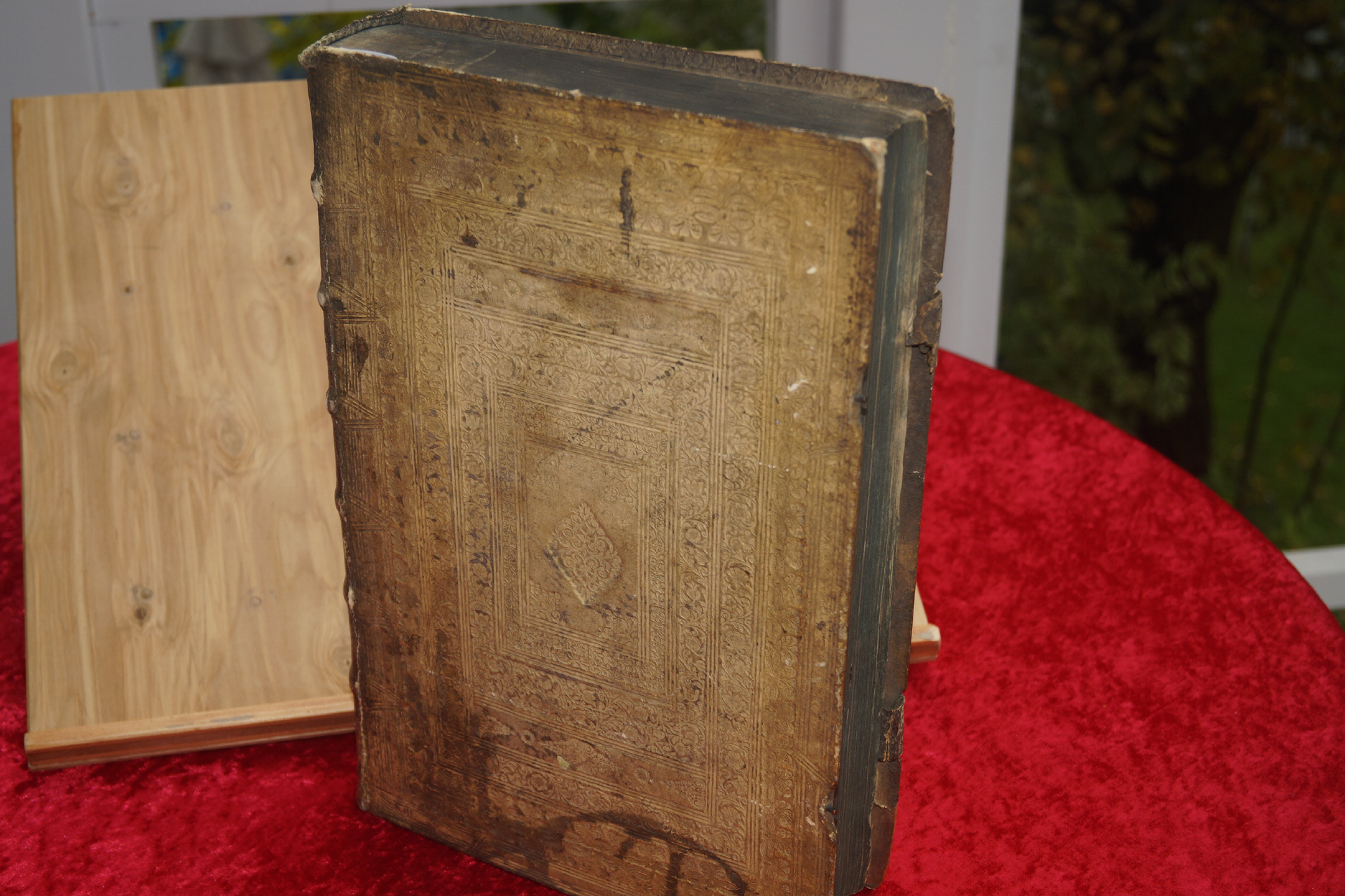 Sehr schöner blindgeprägter Ledereinband, fein ziseliert mit Jahresprägung 1594. 1/2 Schließen.