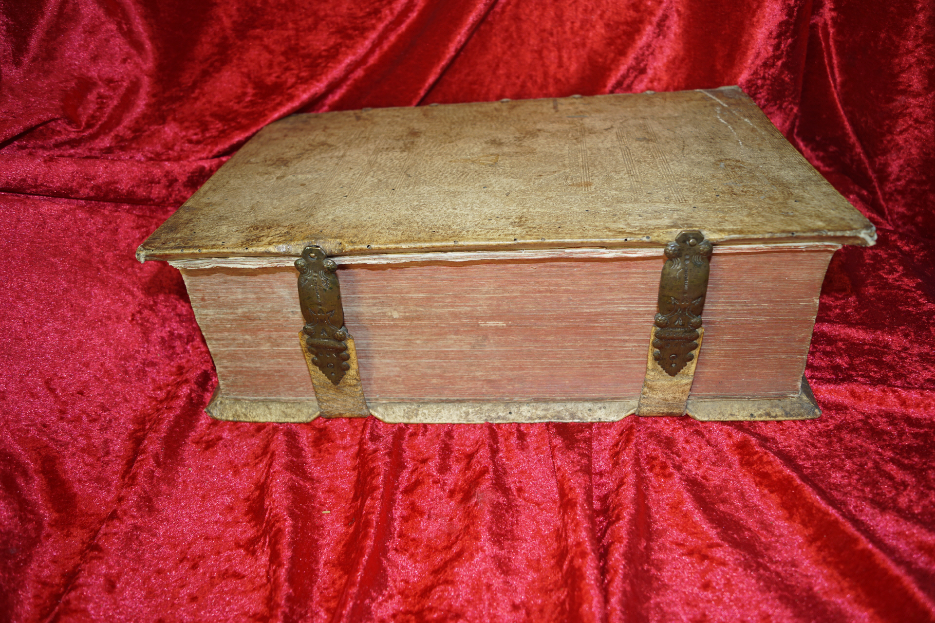 Selten einige unterlegte Seiten, hin und wieder nachgedunkelt, Einband bestossen. Mit 7/8 Eckbeschlägen, die Schließen fragmentarisch vorhanden.