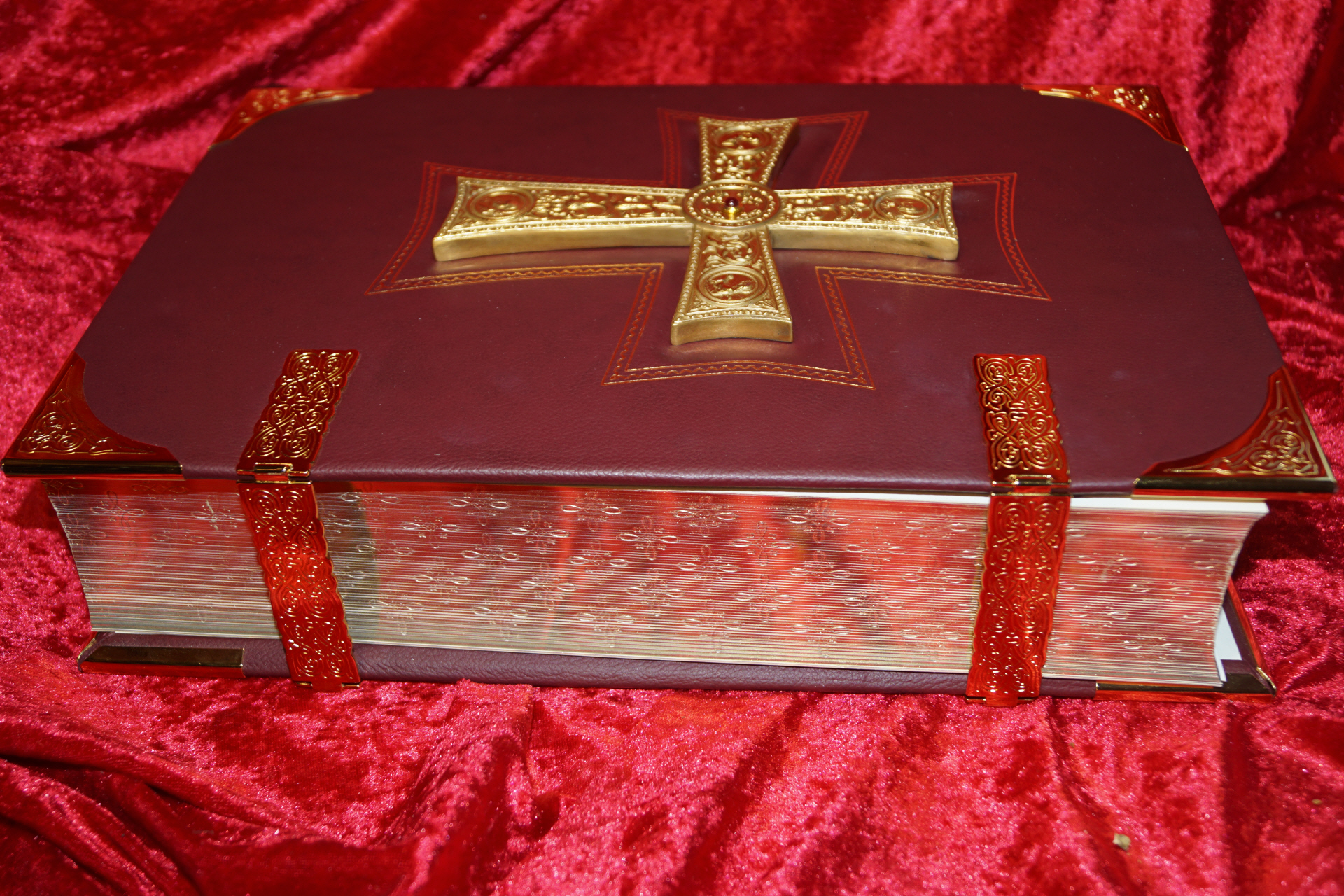 Einband: Luxusbindung in Echtleder mit acht Eckbeschlägen, zwei goldenen Schließen und punziertem Goldschnitt, in einer edlen Schmuckkassette Abnehmbares Kreuz mit Rubin.