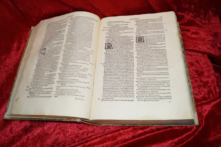 F. Valgrisi, 1588. Fol. (35:25 cm). Mit 1 (statt 2) Druckermarke, doppelblattgr. Holzschn.-Plan u. 1 fast blattgr. Holzschnitt sowie zahlr. figürlichen Initialen und Vignetten. 24 Bll., 492 S. Ohne das letzte nn. Bl. Alter Hprgt. mit Inkunabelpapierbezug, berieben u. bestoßen, Rücken mit 2 kl. Wurmlöchern.
