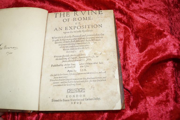 Im Kern geht es darum, dass Dent den (bevorstehenden) Untergang des Papsttums anhand der Offenbarung "nachweist". Interessant auch, weil nicht in Latein sondern in durchaus lesbarem alten Englisch verfasst.