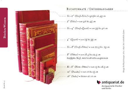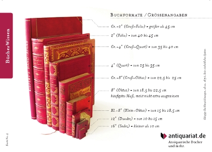 Am Anfang werden Sie vielleicht von den Beschreibungen der Auktionstexte etwas überfordert sein – das geht fast jedem so. Sie werden die meisten Kurzformen bald beherrschen. Wichtig ist, dass Sie die Kürzel zu den Buchgrößen verstehen. Oft ist von „Folioformat“ oder von „Oktav“ die Rede. Die unten stehende Grafik zeigt, was in etwa gemeint ist (es sind Richtwerte, was ein „Großfoliobuch“ ist und wo die Grenze zum Folioformat verläuft, darüber kann man auf der Stelle einen prima Glaubenskrieg führen. Im Prinzip handelt es sich um die alten Buchlagen. Das erkennt man noch an den Kürzeln 20 (Folio) 40 (Quart), 80 (Oktav). Wenn Lagen gefaltet wurden, verdoppelt sich die Blattanzahl – so ähnlich wie wenn Sie ein Din A4 Blatt falten. Simpel eigentlich – wenn man es weiß…