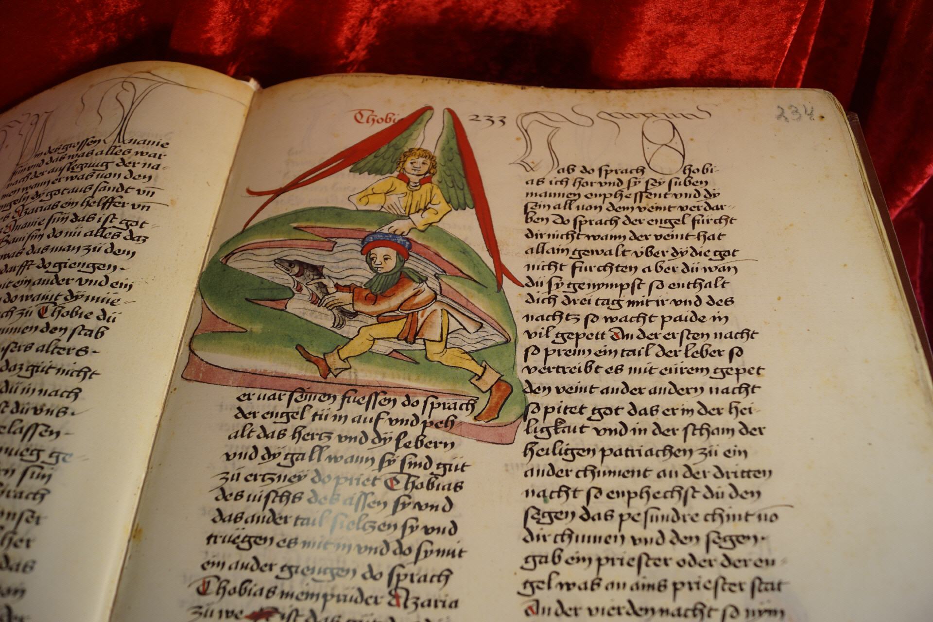 1534 – das Datum ist eine Zäsur und meint, das werden sie sicherlich wissen, die Herausgabe der Vollbibel der Lutherbibel. Bekannt ist auch, dass das weder die erste Bibel in deutscher Sprache noch die erste gedruckte Bibel war. Wir haben vom 8. bis zum 14. Jahrhundert eine ganze Menge (ca. 800 Stück, Wenzelbibel, diverse Armenbibel) Klosterhandschriften, Bibelabschriften, manch prachtvollen Evangeliar, Stundenbücher und dergleichen mehr überliefert.